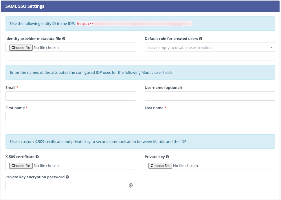 http://andhttps://- aren’t part of it.Verify request signatures or a SSL certificate - If the IDP supports encrypting and validating request signatures from Mautic to the IDP, generate a self signed SSL certificate. Upload the certificate and private key through Mautic’s Configuration > User/Authentication Settings under the ‘Use a custom X.509 certificate and private key to secure communication between Mautic and the IDP’ section. Then upload the certificate to the IDP.