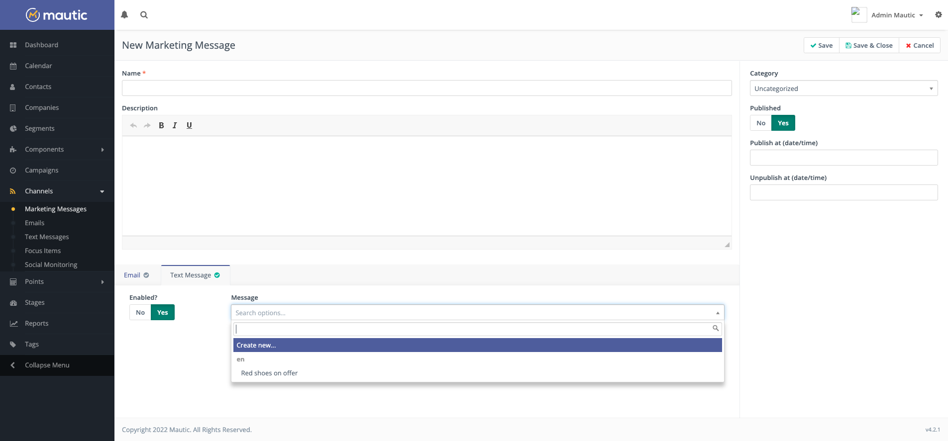 Mautic allows you to create a single message - for example ‘Red shoes on offer today!’ - in multiple Channels, and have it delivered through the Channel which the Contact prefers. This means that they only receive the message once, and through their preferred Channel. You can create the messages under the Marketing Messages section.