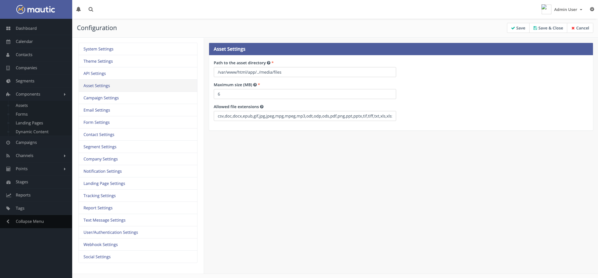 If you need to add extra file types, configure the maximum size of upload or the Assets directory, navigate to Configuration > Asset Settings.