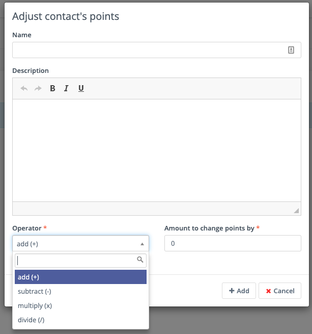 Adjust Contact’s Points: this action allows you to add, subtract, multiply or divide a Contact’s score. Select the operator and the amount to change the Points by - for example: add 10, subtract 5, multiply by 3, divide by 2. If the Form is collecting information which doesn’t identify the Contact, Mautic saves the Points to the anonymous Contact record. If that anonymous Contact record converts to or merges with a know Contact record based on some identifying event such as a Form submission, the Points stay with the Contact.