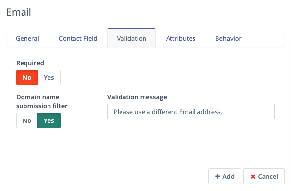 To apply domain name filtering on a Mautic Form, add an Email field to the Form - after setting up the domain exclusions in the previous step - and under the Validation tab, set the Domain name submission filter switch to Yes.