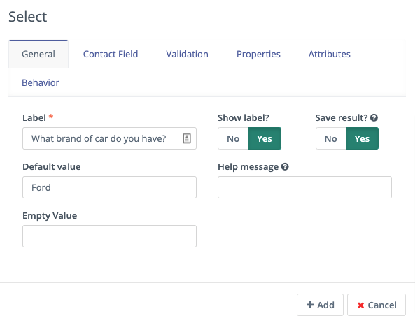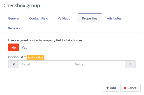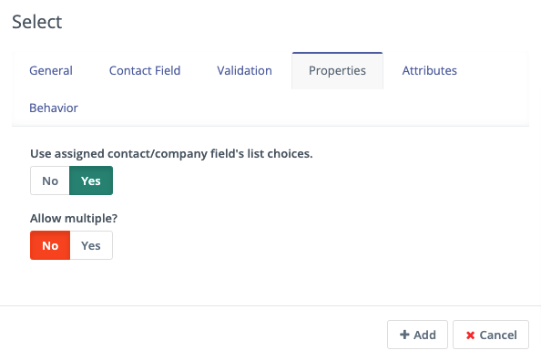 If you have defined the values in the Custom Field, turn the first switch to Yes to use those values. Otherwise, create the labels and values in the Properties tab. You can also associate the Form Field with a Contact field where appropriate.