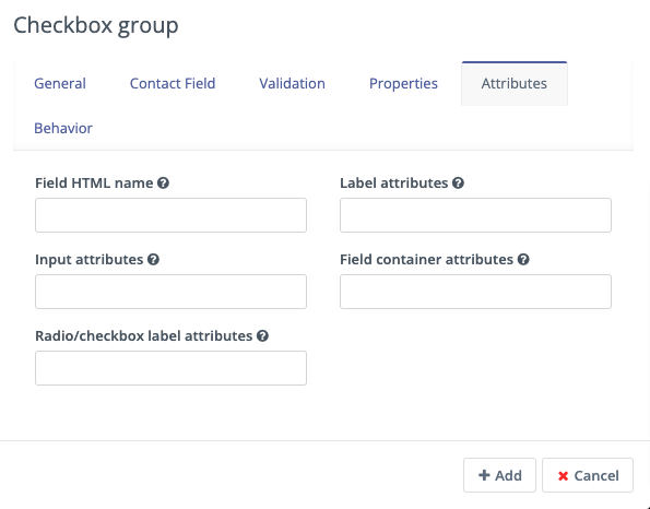 Checkbox Group - This field allows a visitor to select one or more options from a list using checkboxes. This field type can also provide a single checkbox - for example to gain consent to use cookies and send marketing Emails or other messages to the Contact.