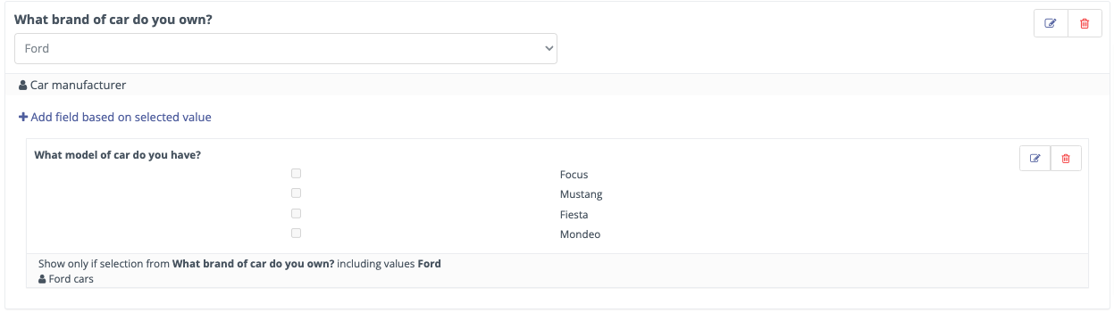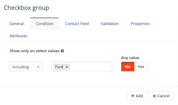 In this example, select the Checkbox Group option, and under the Condition tab, choose including and Ford.