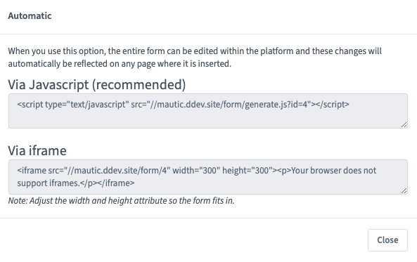 The Embedded option for embedding Mautic Forms uses JavaScript and ensures that the Forms on your website are always up to date with what you have set in Mautic. If you make changes to the Form in Mautic, you don’t have to worry about re-copying the Form code everywhere you use the Form. Features including auto-fill and progressive profiling only works with the Embedded option.