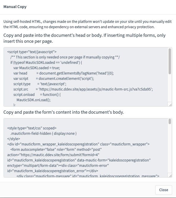Other than using shortcodes with a CMS Plugin, this is the recommended method for embedding your Mautic Forms. Copy the line of code in the box and paste it into your website where you want the Form to display.