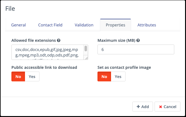 When uploading a file within a Form there are several options under the properties tab:
