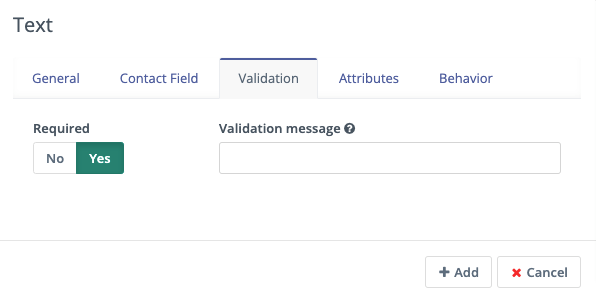The validation tab allows you to set whether the field is mandatory or not. If the field is mandatory and it’s not completed by the visitor, the Form displays an error and the visitor sees a message informing them that they must complete the field before submitting the Form.
