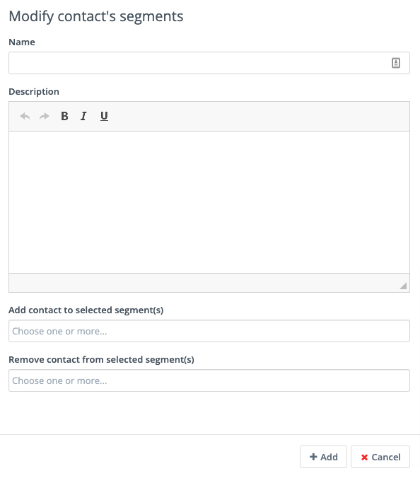 Modify Contact’s Segments: this action allows you to change a Contact’s Segment membership when they submit a Form. Type in the name of the Segment to add the Contact to or remove the Contact from. You can use both fields at the same time, and can include multiple Segments in either or both fields.