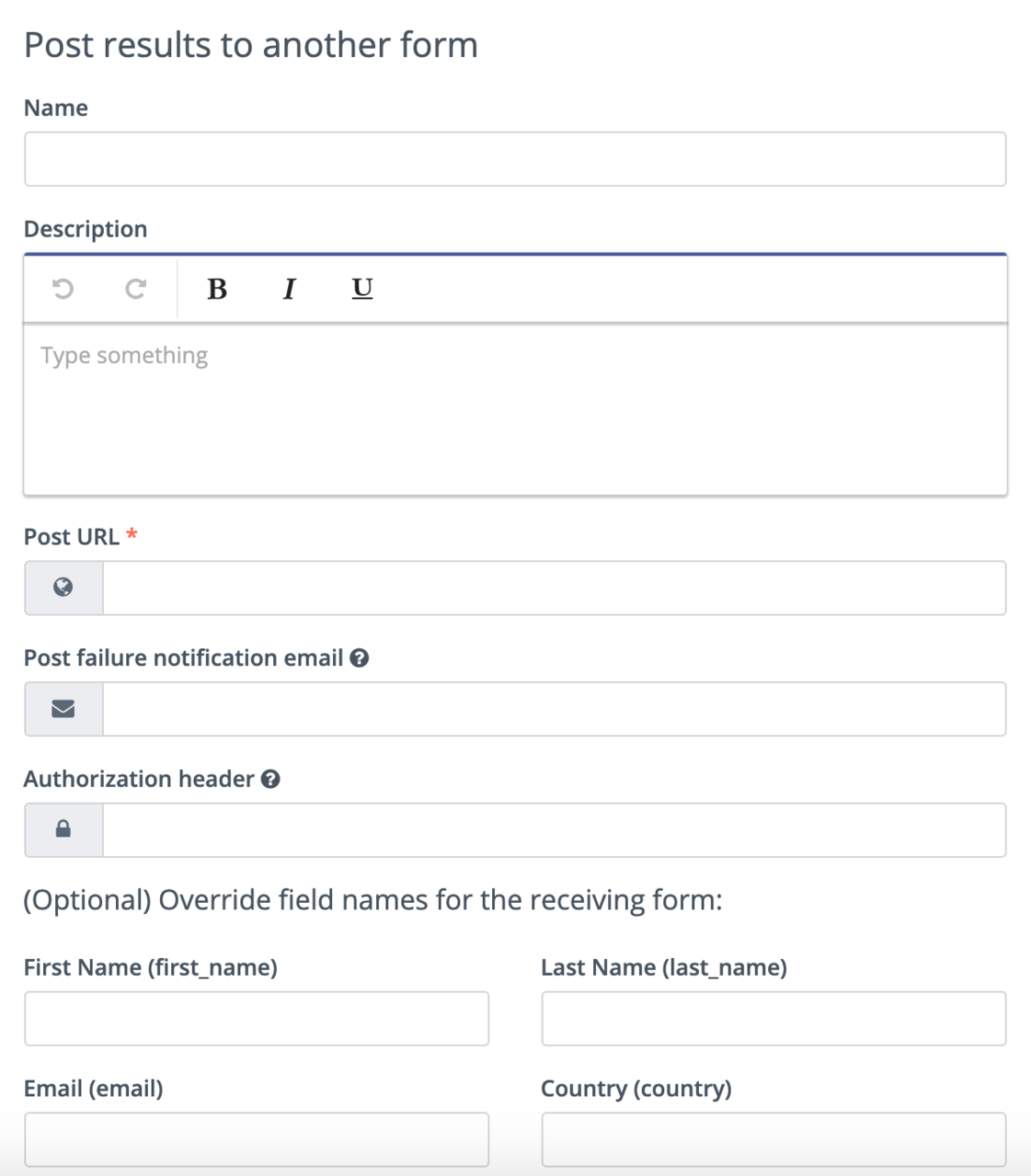 POST results to another Form: use this option to connect your Mautic Form with some other Form. You may have Forms in other tools which you use for tracking and reporting, or back-end Forms triggering software instance creation.