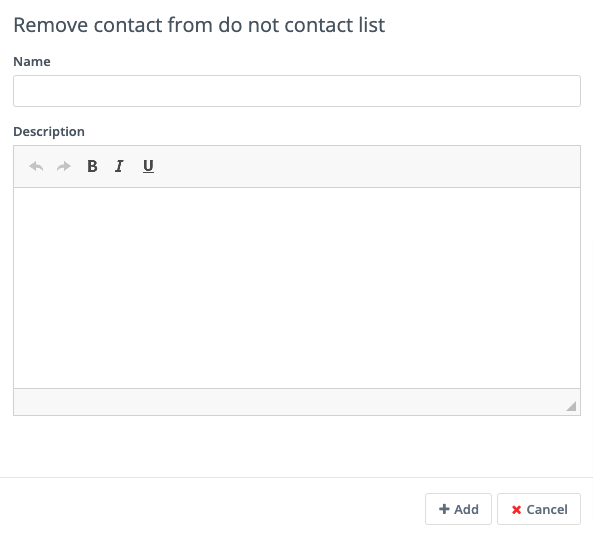 Remove Contact from Do Not Contact list: this Form action allows you to remove a Contact from the Do Not Contact list when they submit a Form. Use this if a Contact has at some time unsubscribed from your Email list, and by filling out the Form, are giving you permission to Email them again.