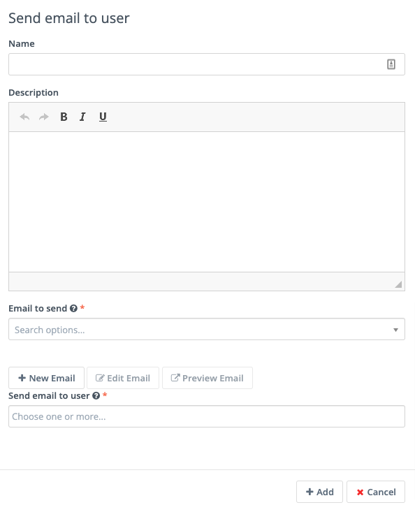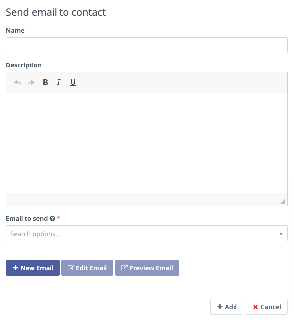 Send Email to Contact: to directly Email the Contact after they submit the Form, use this option. Select a Template Email from the list, or click New Email to build a new one. After selecting an Email, you can also make edits to the Email in a popup window and preview the Email.
