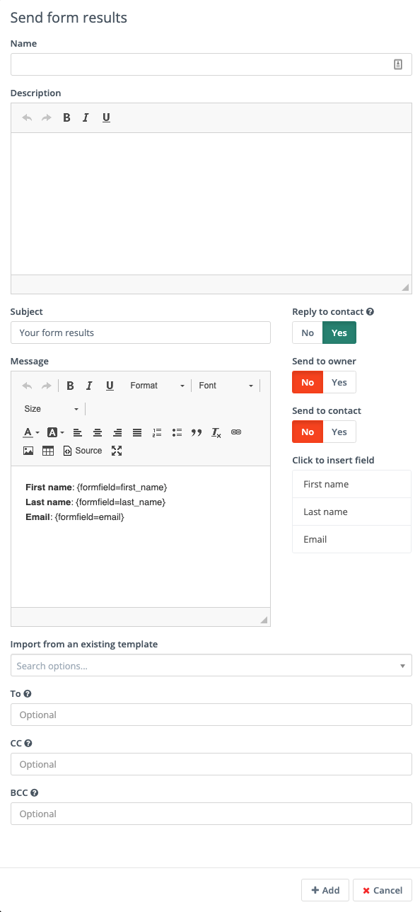 Send Form results: this feature is commonly used for the purposes of a notification when a Contact submits a Form. It can also send a notification to the Contact of the data provided. Be sure to customize the subject line to state which Form the submission relates to. The Reply to Contact option sets the