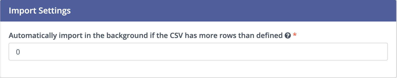 Automatically import in the background if the CSV has more rows than defined - If there are more than the specified number of rows in an import file, the CSV automatically sets to import in the background which requires a cron job to trigger. Set to 0 if you want to always import files in the background recommended for performance optimization.