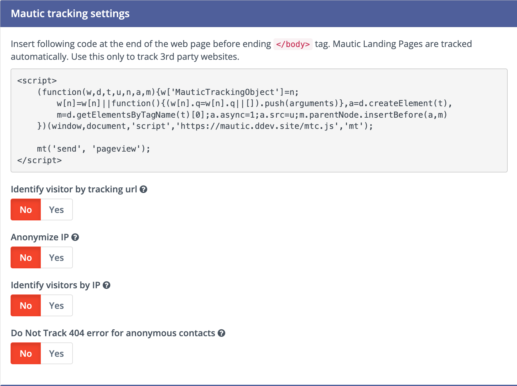 Tracking code - Insert this code on any page you would like to have tracked in Mautic before the ending