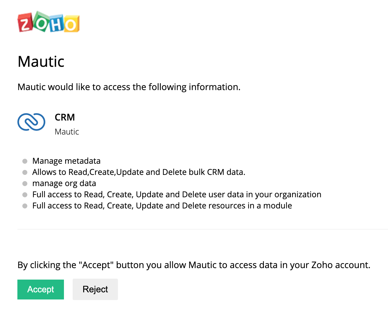 Select the correct data centre based on the URL of your Zoho CRM instance, and click the button to authorize the Plugin to access your instance. A popup window prompts you to log into Zoho and to authorize access - select Accept.