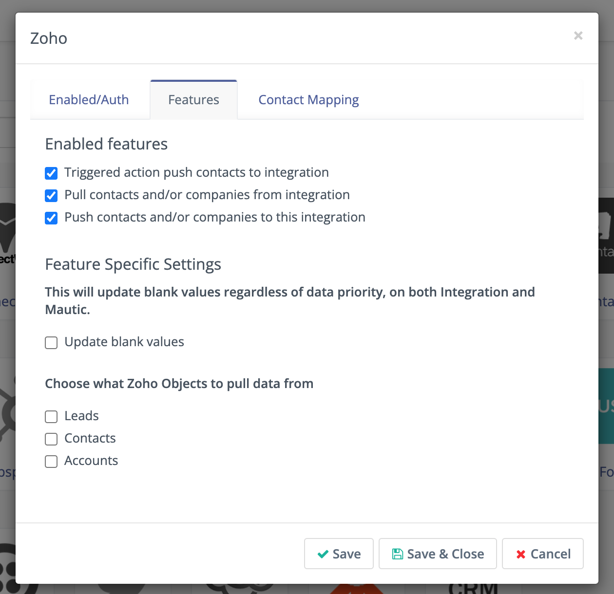 If the values are empty for the Mautic object, a value of ‘Unknown’ is sent. If the ZohoCRM field is a pick list, be sure the list values of Mautic’s field match those of the field in ZohoCRM.
